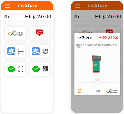 支持二维码支付和NFC。我们的智能POS已获得八达通有限公司的认证,并能接受八达通、银联云闪付、支付宝、微信支付和Atome等支付方式。
